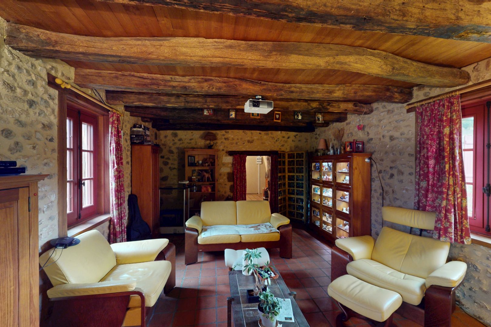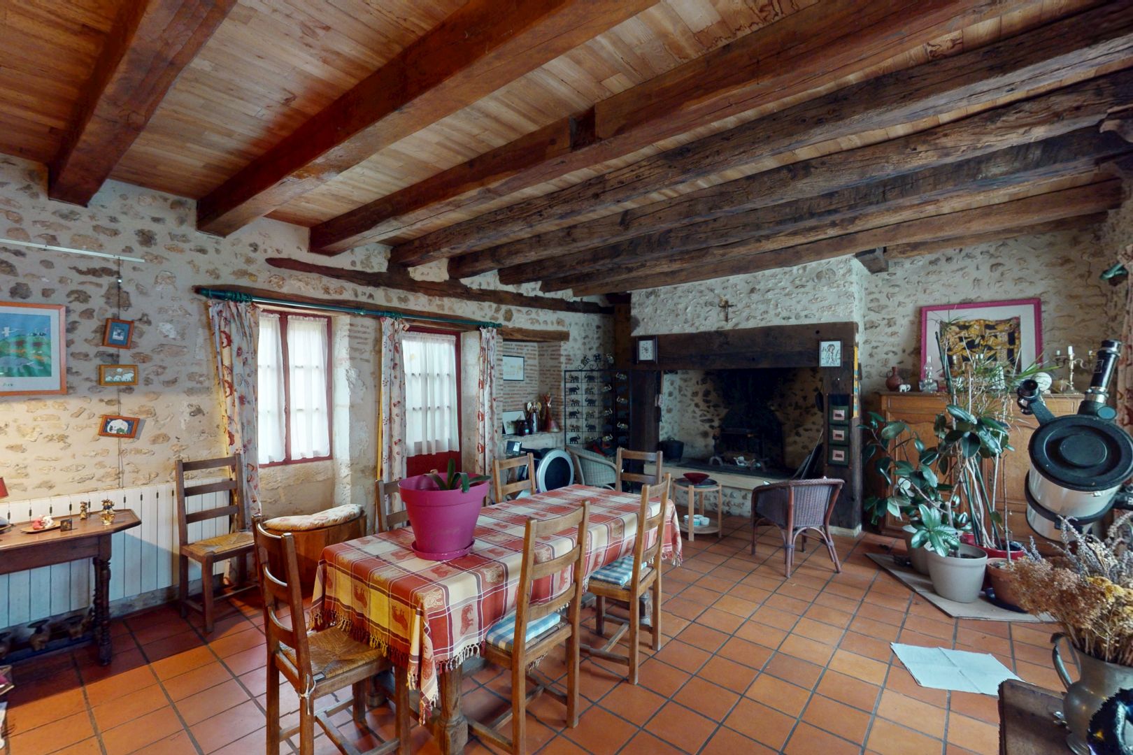 - Séjour(s) avec cheminée d'environ 40 m². Sol carrelage.