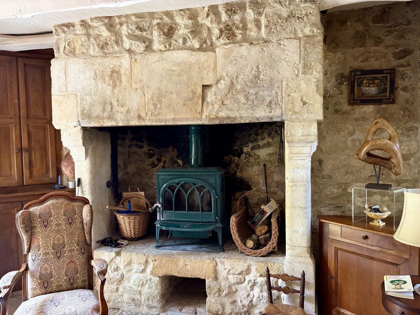 - Pièce(s) à vivre avec coin cuisine et poele à bois dans la cheminée en pierre.