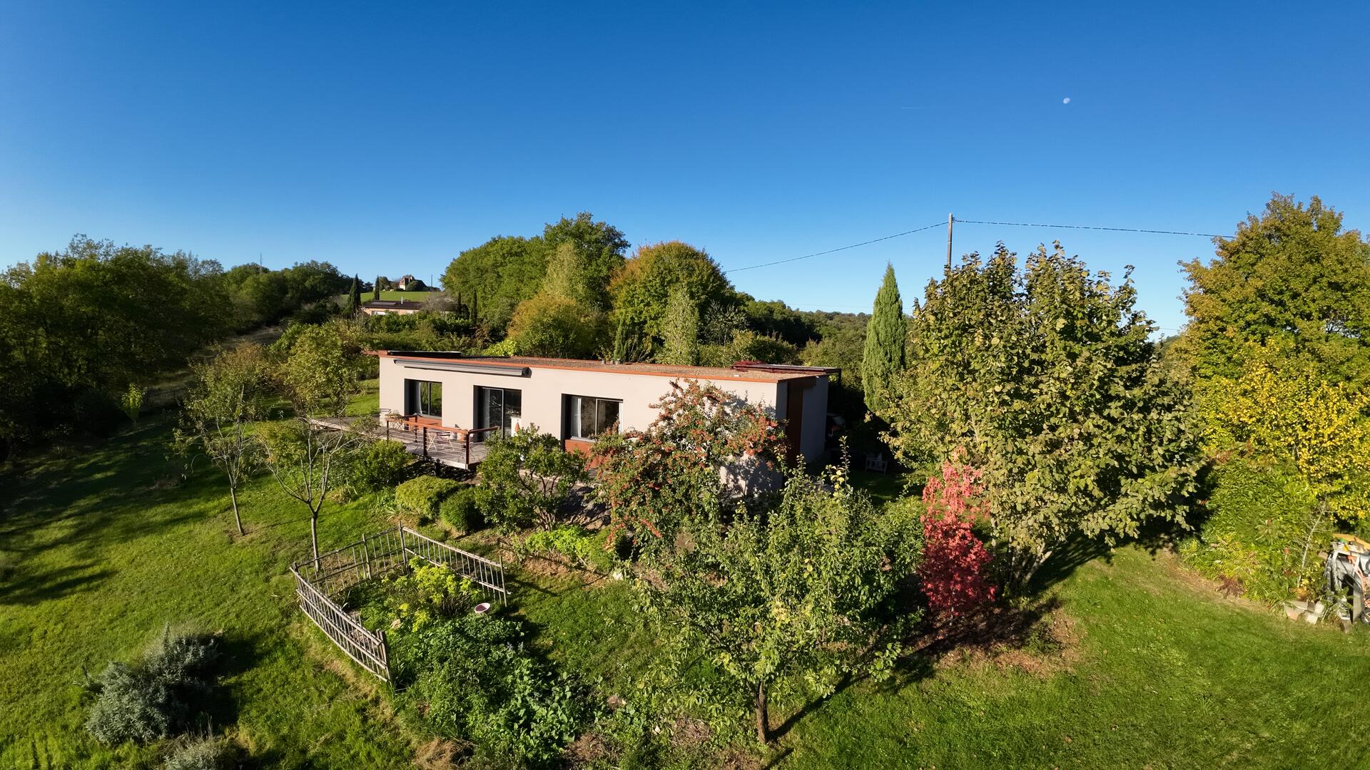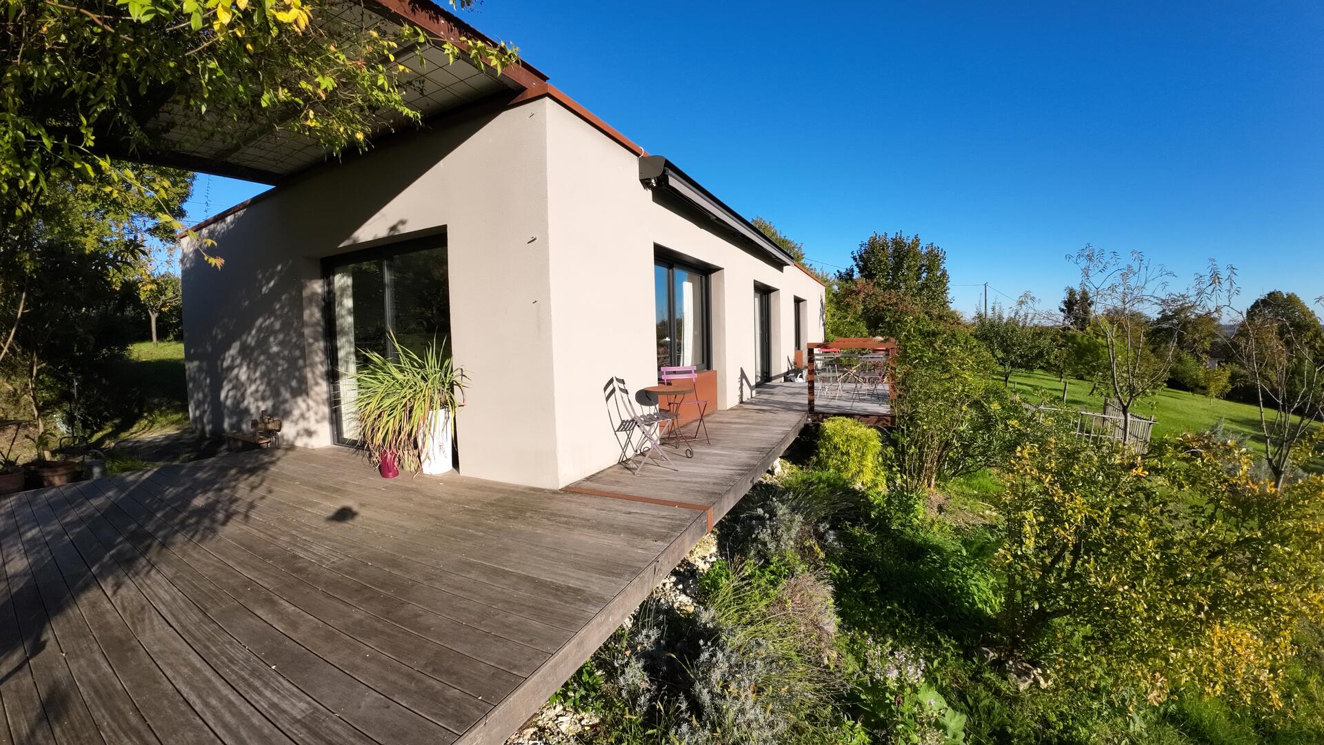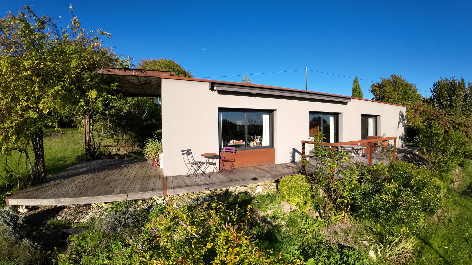 Située dans un environnement paisible et verdoyant, cette belle maison contemporaine construite il y a tout juste 10 ans séduit par son architecture moderne, ses volumes généreux et ses prestations de qualité. D’une surface habitable d’environ 98 m², elle propose une vaste pièce de vie lumineuse de 34 m², baignée de lumière grâce aux grandes baies vitrées et offrant un accès direct aux terrasses et au jardin. Une cuisine ouverte entièrement équipée avec îlot central prolongée par un coin repas convivial et fonctionnel. Deux chambres de 16,5 m² et 11m² avec placards intégrés et vue sur le jardin. Une salle de bains moderne de 7,5 m² avec douche à l’italienne et baignoire. Un cellier pratique de 8,5 m². À l’extérieur, construction de qualité avec façades rehaussées d’acier Corten, effet rouillé esthétique et durable. Le terrain d’environ 4 700 m², arboré et paysagé, offre un cadre de vie serein et préservé avec plusieurs terrasses agrémentées de voiles d’ombrage et d’un store banne. L’orientation sud-est permet de profiter d’une excellente luminosité tout au long de la journée. Un abri voiture attenant et un espace de stationnement complètent le tout. Les informations sur les risques auxquels ce bien est exposé sont disponibles sur le site Géorisques: www.georisques.gouv.fr